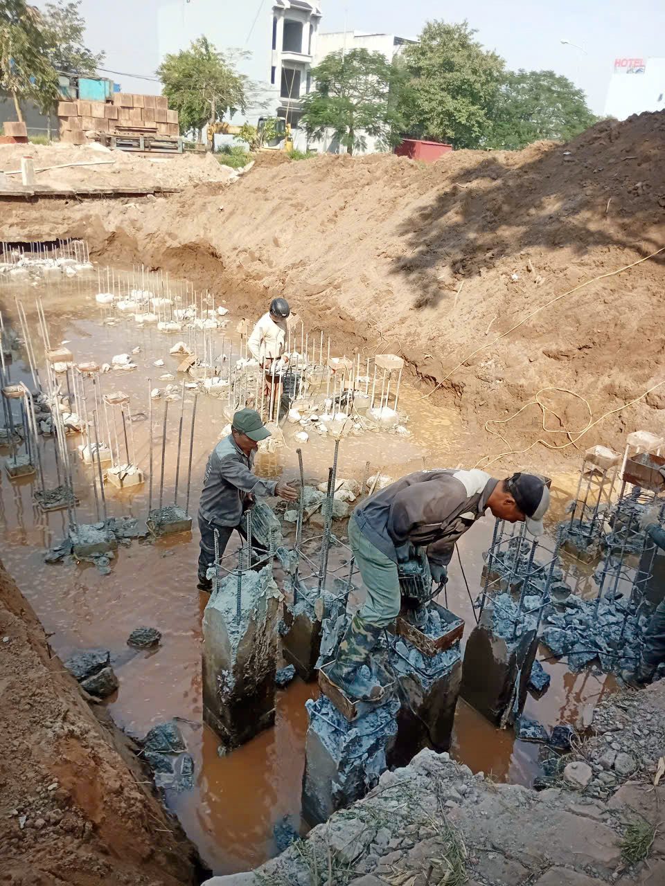 Trước khi tiến hành, kỹ thuật hiện trường đã kiểm tra lại toàn bộ cao độ, tim cọc và cốt chuẩn theo bản vẽ thiết kế. Việc này giúp đảm bảo đầu cọc sau khi đập sẽ đúng cao độ, tạo mặt phẳng chuẩn để liên kết với đài – giằng móng.