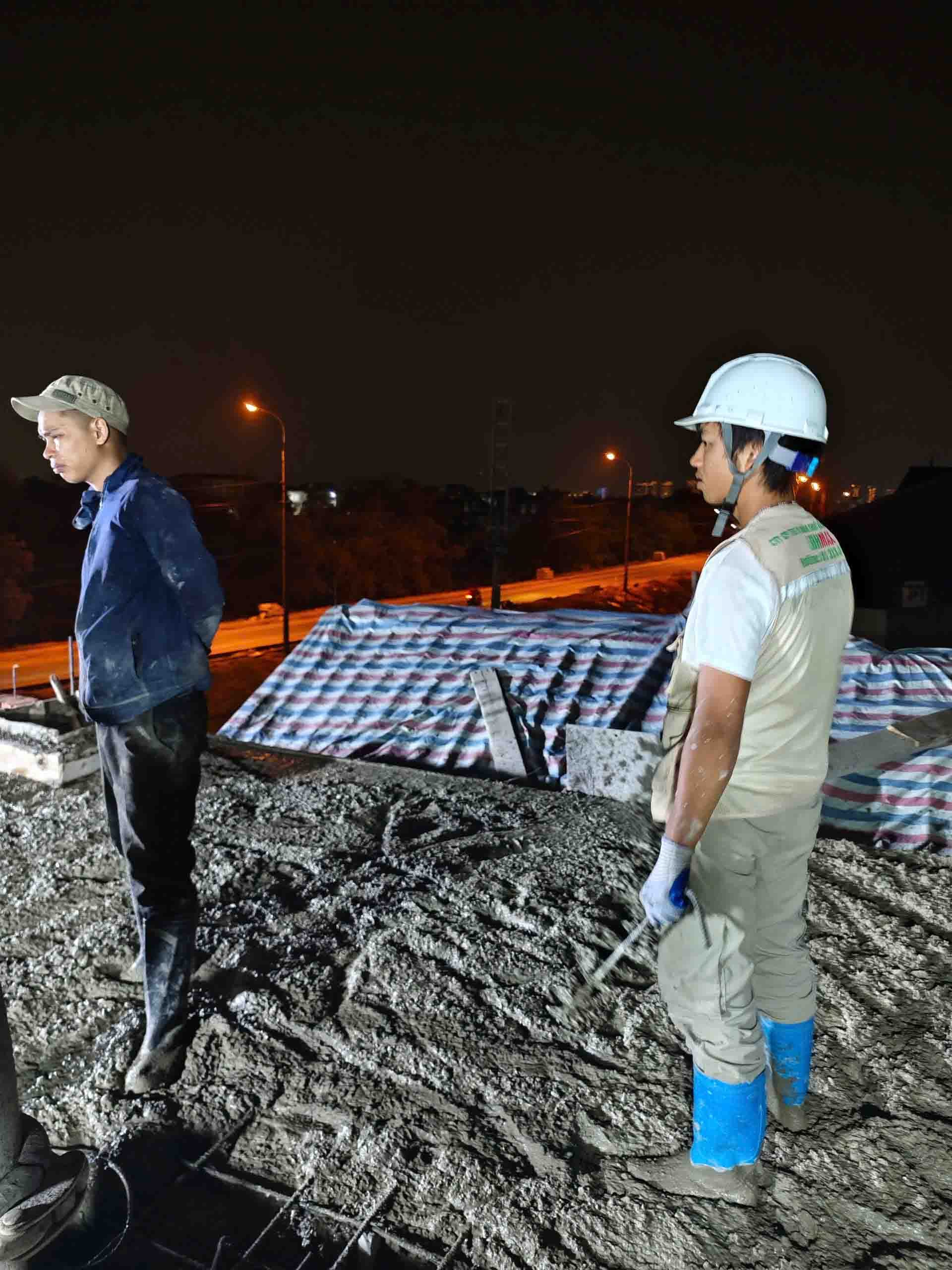 ? Vào đêm qua, đội ngũ kỹ thuật và giám sát công trình của công ty đã trực tiếp có mặt tại công trường để kiểm tra, giám sát quá trình đổ bê tông mái tầng 2. Dù thời điểm thi công là ban đêm, nhưng toàn bộ anh em công nhân và cán bộ kỹ thuật đều làm việc với tinh thần nghiêm túc, tập trung cao độ nhằm đảm bảo tiến độ và chất lượng cho hạng mục quan trọng này.