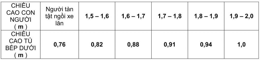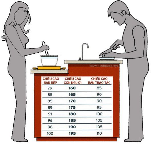 – Chiều cao bếp đảo loại có bếp nấu kết hợp bàn thao tác sẽ phụ thuộc vào chiều cao của con người theo bảng dưới đây: