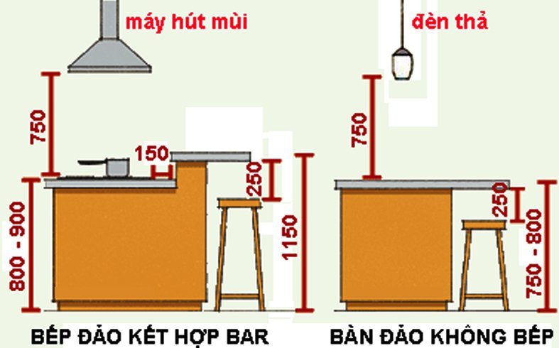 – Chiều cao bếp đảo kết hợp bar thì bàn đảo cao từ 800-900, chiều cao bar cao 1150, chiều cao từ mặt bếp đến đáy máy hút mùi là 750. Còn chiều cao bàn đảo không có bếp là từ 750-800, đèn thả ở trên nếu có thì cao cách mặt bàn 750 mới thao tác rõ được. Chiều cao mặt ghế cách đáy bàn tối thiểu 250 thì ngồi mới thoải mái không bị cấn đầu gối.