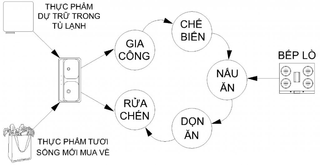 a) Căn cứ vào qui trình hoạt động trong diện tích nhà bếp: