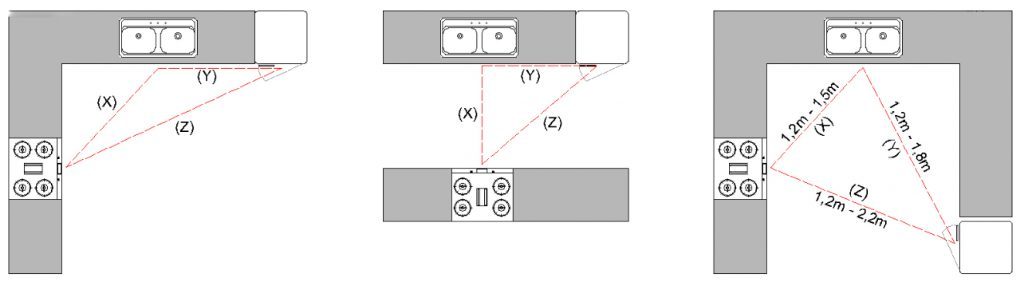Theo hình trên thì ta có cách tính “tam giác hoạt động” như sau : X + Y + Z < 6m, dựa vào công thức này để ta tính toán cho hợp lý khi lựa chọn kích thước nhà bếp.