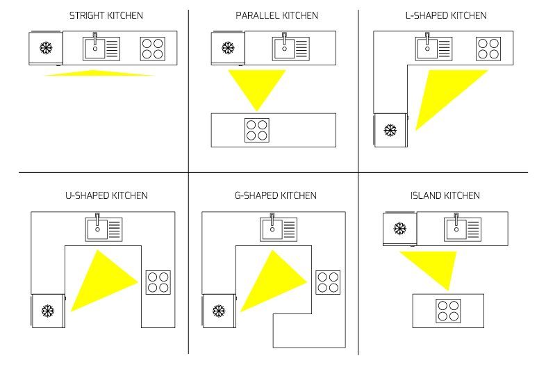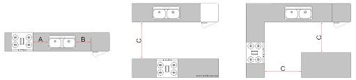 – Các phép đo dưới đây được ứng dụng phổ biến trong thiết kế nhà bếp: hình chữ U, hình chữ L và nhà bếp song song có đảo bếp.