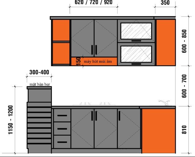 – Chiều cao tủ bếp trên, tủ bếp dưới và khoảng cách giữa 2 tủ bếp mình đã nói ở trên hoặc bạn có thể xem hình.