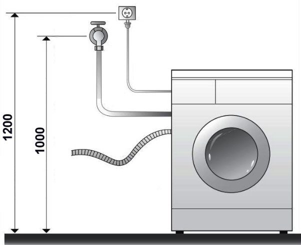 – Chiều cao tủ bếp dưới nếu có đặt máy giặt cửa ngang âm tủ là 1000. Chiều cao vòi nước nếu để máy giặt lộ thiên là 100, chiều cao ổ cắm điện máy giặt là 1200.