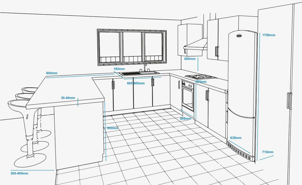 Xin lưu ý: Những phép đo này chỉ là gợi ý hướng dẫn. Cách tốt nhất là liên hệ với một chuyên gia thiết kế để biết kích thước chính xác các kích thước thiết bị nhà bếp phù hợp diện tích phòng bếp gia đình bạn.