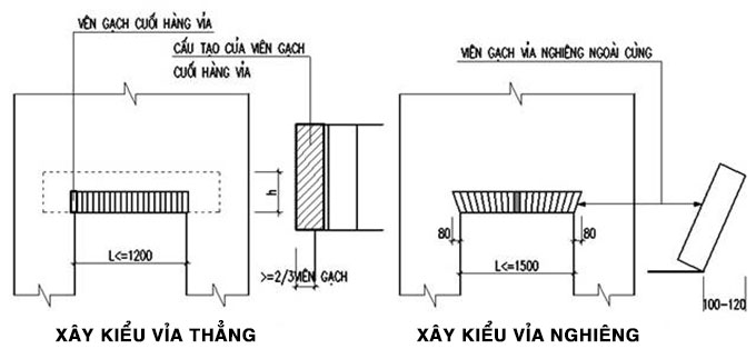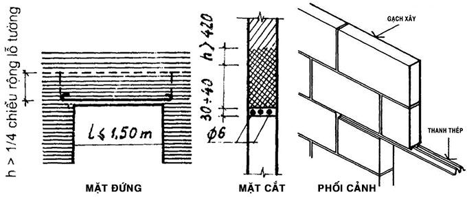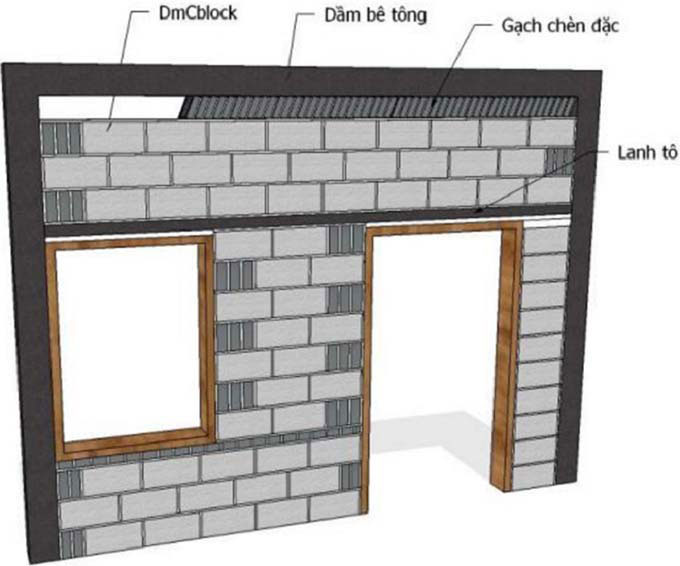 Được xây giống như kiểu xây gạch thông dụng nhưng bắt buộc ở phía dưới lanh tô phải có thanh thép tròn D=6mm hoặc thép bản 20x1mm. Đầu thép sẽ đặt sâu vào bên trong tường ít nhất là từ 1 – 1,5 viên gạch. Khi hoàn thiện sẽ dùng vữa xi măng cát để phủ bên ngoài. Lớp vữa này sẽ có mác trên 50 và dày từ 2-3 cm.