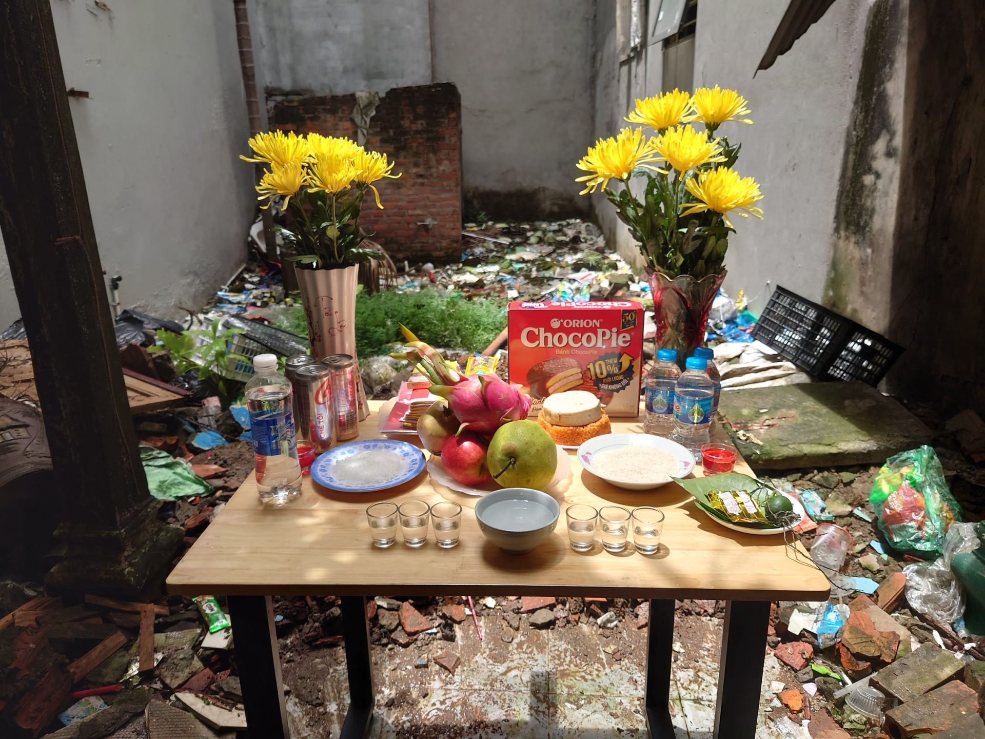 Buổi lễ khởi công được chuẩn bị một cách chu đáo và trang trọng. Không gian buổi lễ được bày biện với bàn thờ, hoa tươi, và các lễ vật phong phú như trái cây, bánh kẹo, nước uống và các đồ cúng khác. Mọi thứ đều được sắp xếp cẩn thận, thể hiện sự tôn kính và trang nghiêm, cầu mong cho dự án được thuận lợi và thành công.