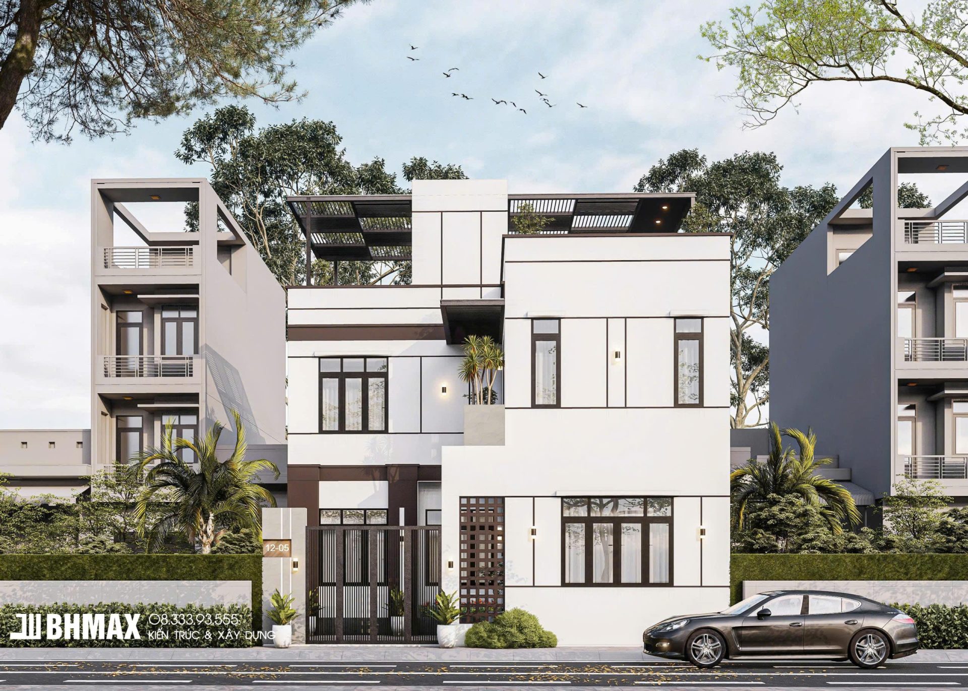 Vật liệu cao cấp: Sử dụng phổ biến vật liệu hiện đại như kính cường lực cho hệ thống cửa và lan can, giúp lấy ánh sáng tự nhiên tối đa, tạo cảm giác rộng mở. Mặt tiền tầng trệt có thể ốp đá tự nhiên màu xám để bảo vệ tường và tăng tính thẩm mỹ.