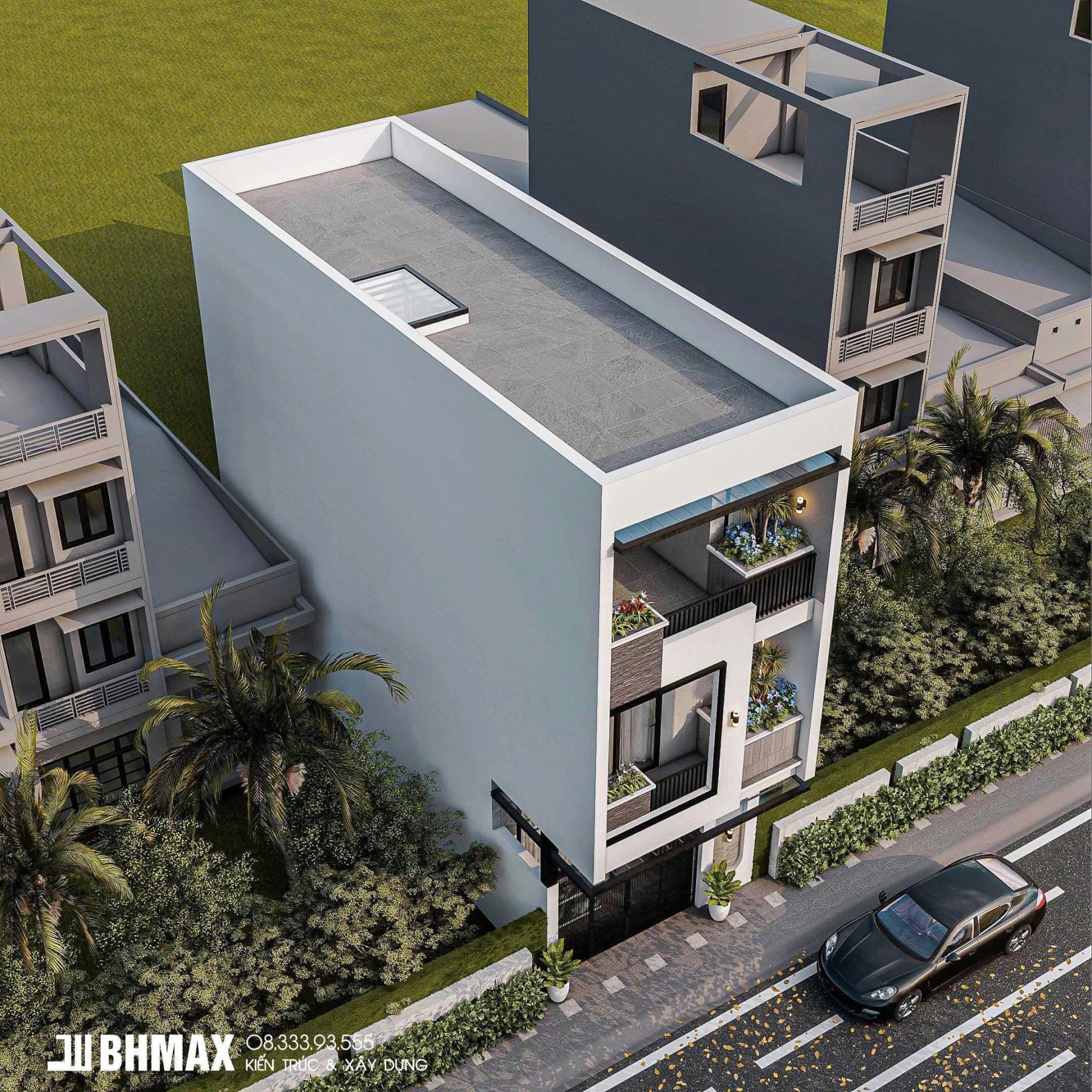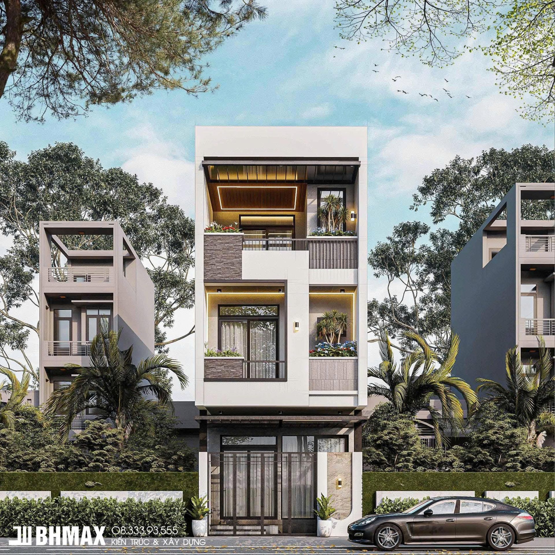 Mẫu nhà phố hiện đại này là một thiết kế nhà ống phổ biến, thường thấy ở các khu đô thị Việt Nam, đặc trưng bởi kiến trúc đơn giản, đường nét thẳng và sự kết hợp hài hòa giữa các vật liệu hiện đại như kính cường lực, đá ốp và gỗ nhựa. Công trình trong ảnh được thiết kế và thi công bởi công ty BHMAX, nổi bật với mặt tiền thoáng đãng và tối ưu ánh sáng tự nhiên.