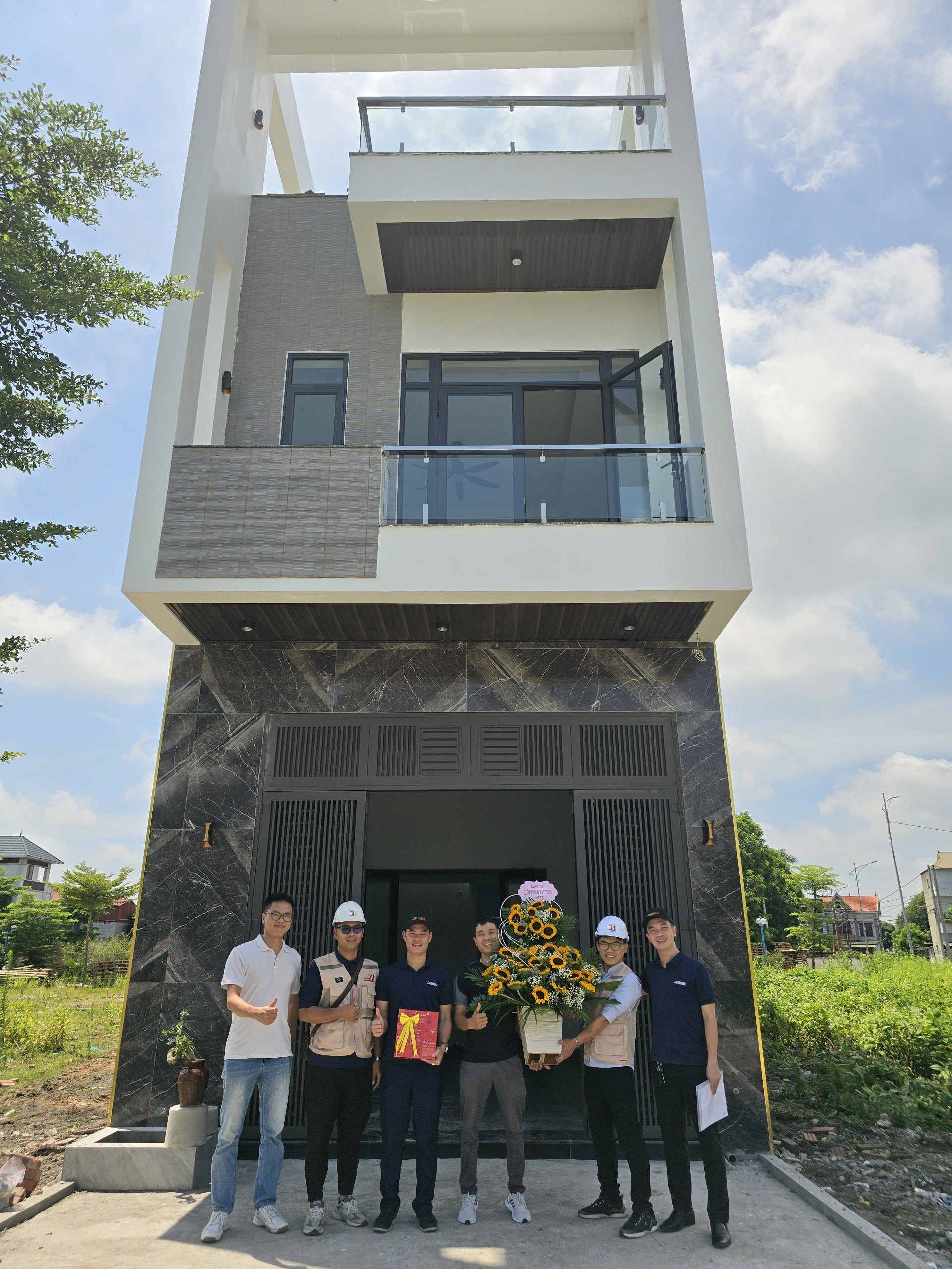 Buổi lễ bàn giao nhà được tổ chức trang trọng với sự tham gia của đại diện Công ty BHMAX cùng đội ngũ kỹ sư, công nhân và gia chủ. Những bó hoa hướng dương rực rỡ được trao tặng không chỉ làm sáng bừng không gian mà còn mang ý nghĩa chúc mừng và hy vọng vào một khởi đầu mới tốt đẹp cho gia chủ. Các thành viên của BHMAX đã trao quà và gửi lời chúc mừng đến gia đình, tạo nên không khí ấm áp và đầy ý nghĩa.